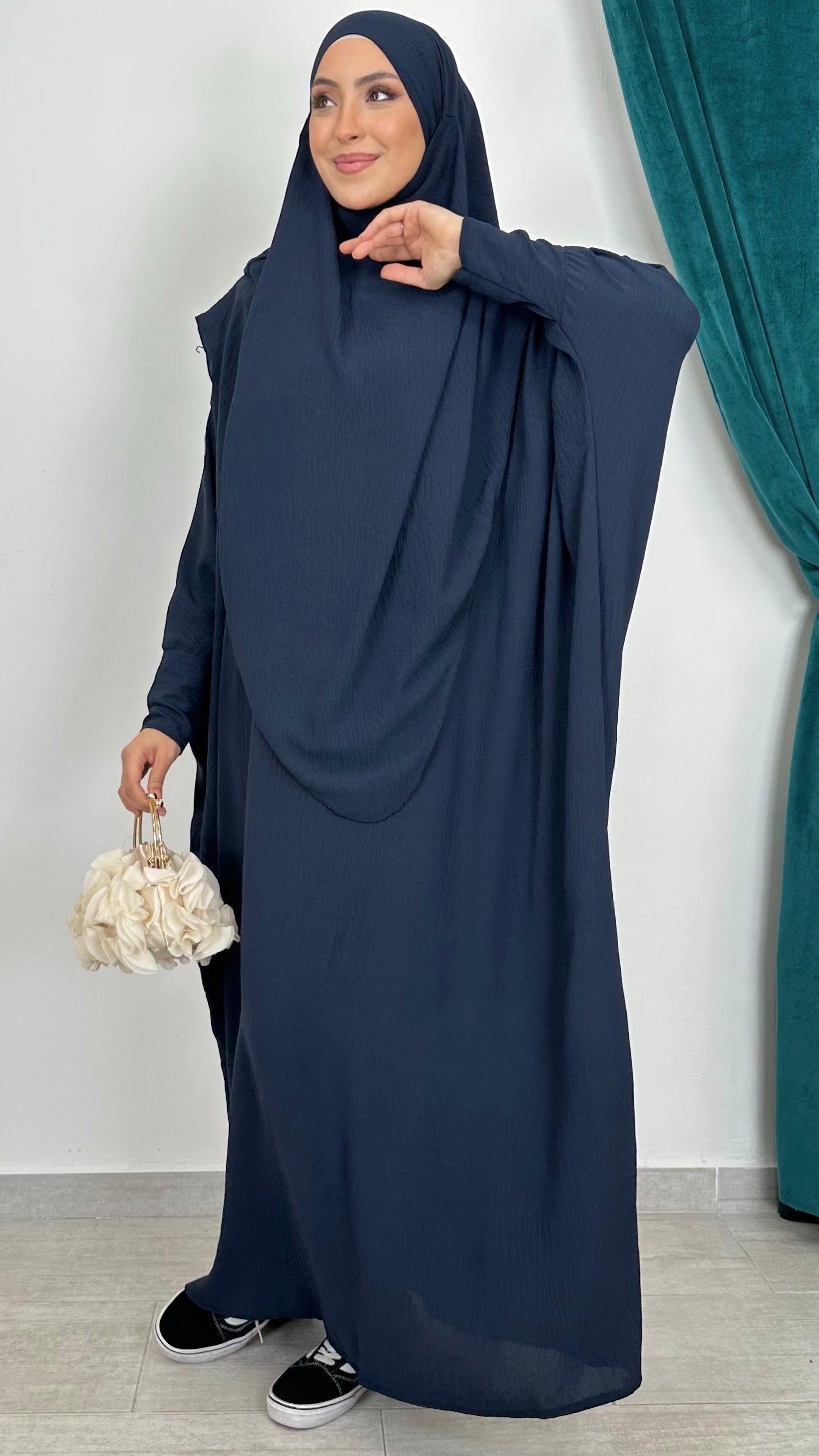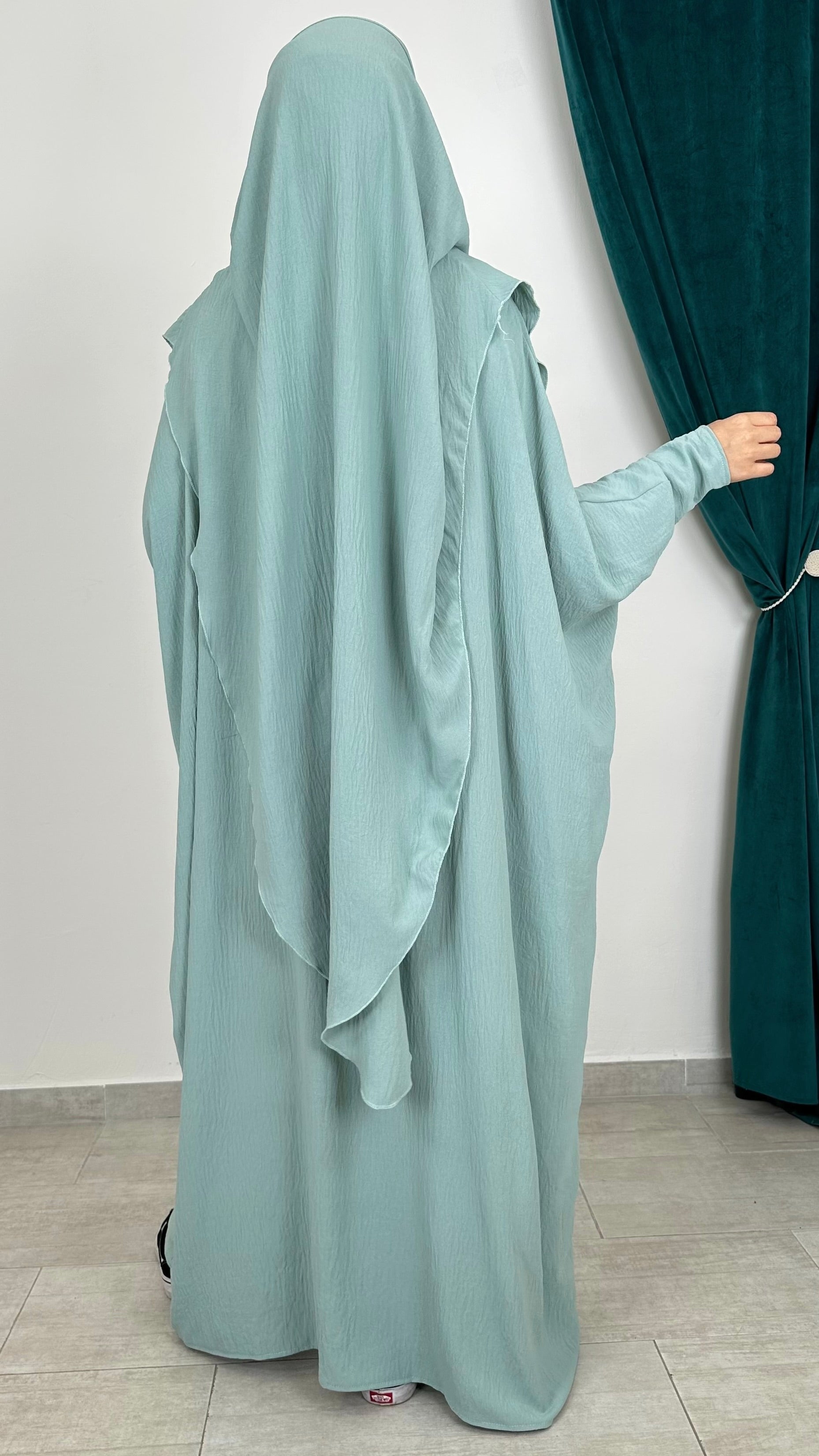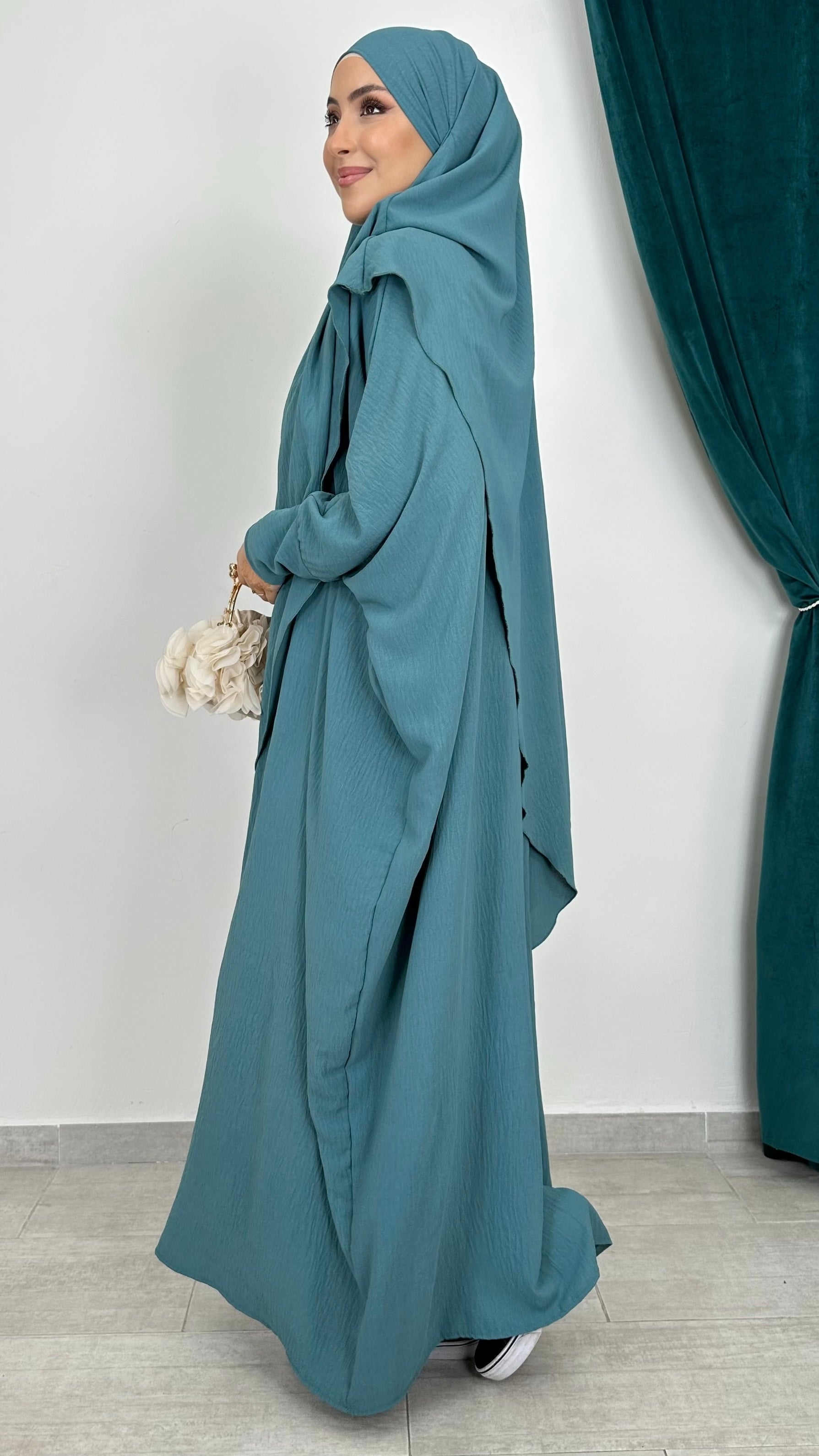 Il hijab abbinato è lungo davanti e ancora più lungo dietro, garantendo una copertura ottimale.
