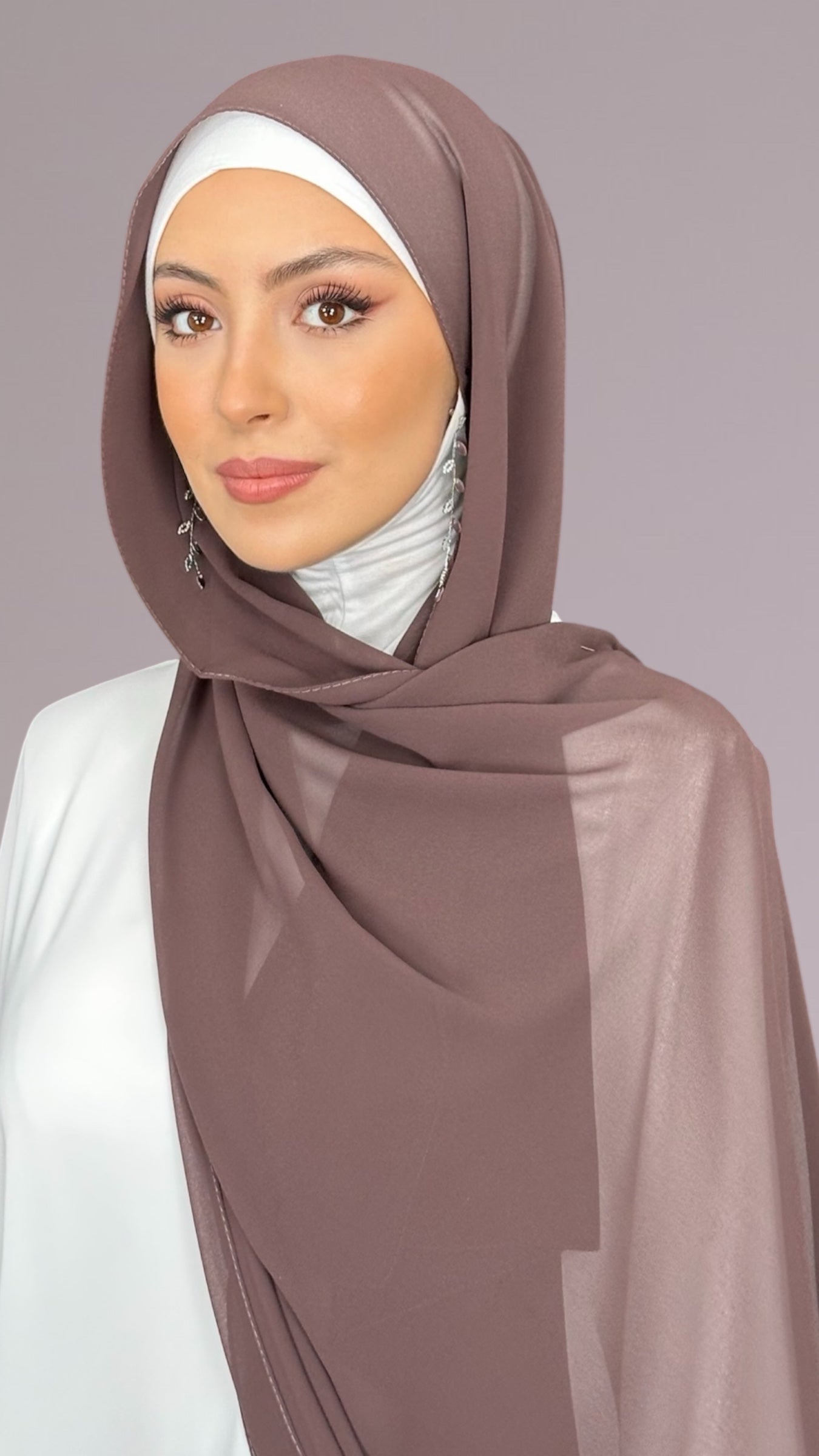 Avvolgiti nella delicatezza sofisticata di Mauve Dust, un hijab in chiffon crêpe dal tono malva cipriato, elegante e senza tempo. Un colore versatile e raffinato, che si adatta con armonia a ogni incarnato e dona un tocco sobrio ma deciso ai tuoi outfit quotidiani o da cerimonia.