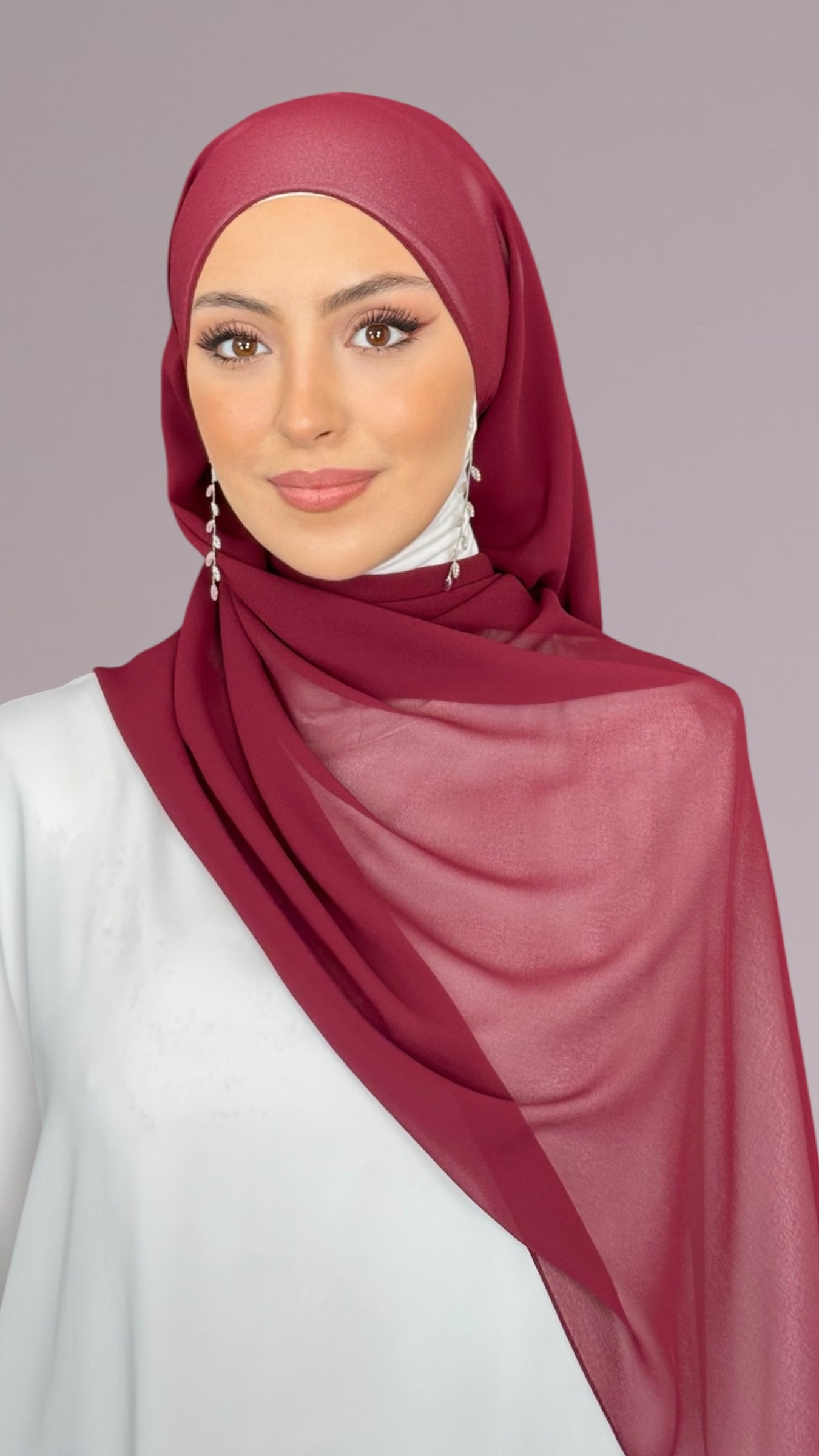 Audace e sofisticato, Ruby Plum è il hijab in chiffon crêpe che conquista al primo sguardo. Una tonalità intensa di prugna con sfumature rubino, perfetta per chi cerca eleganza, carattere e un tocco di mistero.